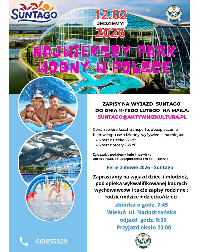 Drugi wyjazd odbędzie się 12 lutego do Suntago – największego parku wodnego w Polsce. To wyjątkowa propozycja na zimowe ferie, łącząca tropikalny klimat, wodne atrakcje i możliwość relaksu dla całej rodziny. Uczestnicy skorzystają z basenów termalnych, stref dla najmłodszych, zjeżdżalni oraz przestrzeni wypoczynkowych. W cenie zawarty jest transport, ubezpieczenie, całodniowy bilet wstępu oraz wyżywienie. Koszt wynosi 220 zł dla dziecka i 265 zł dla osoby dorosłej. Zapisy przyjmowane są do 11 lutego na adres suntago@aktywnizkultura.pl, kontakt telefoniczny: 661 855 829.