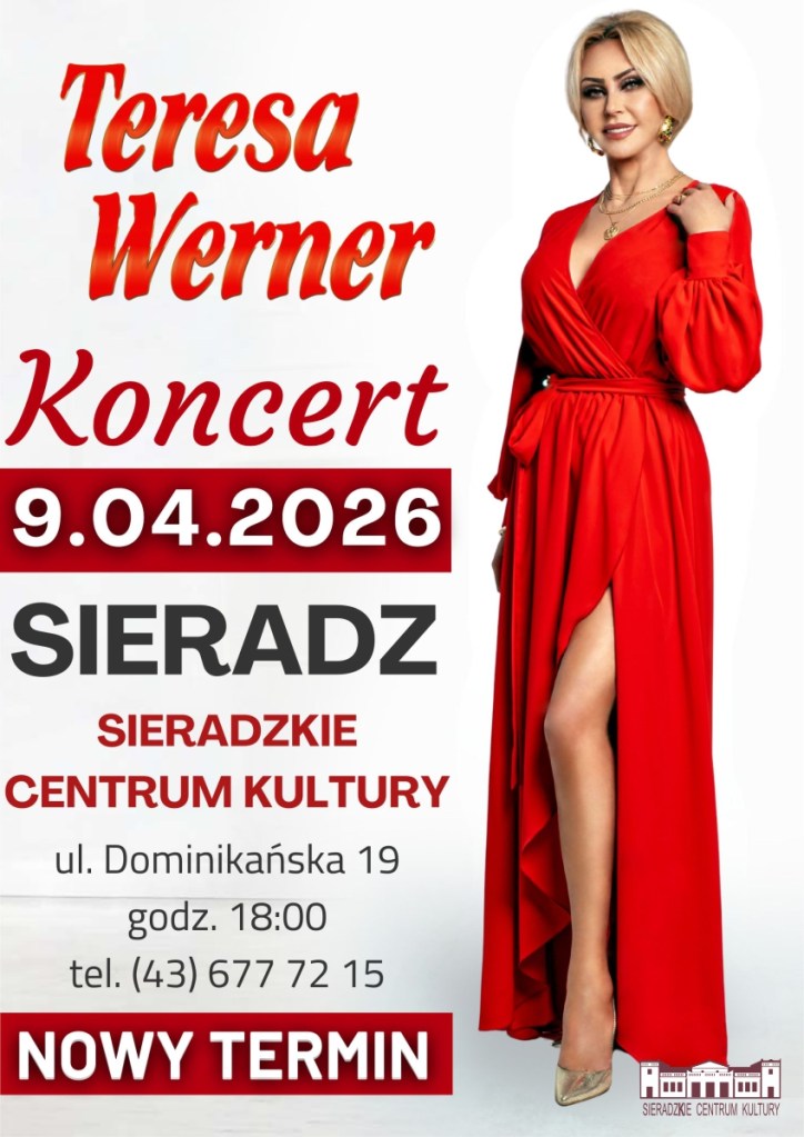 Jak poinformowało dziś Sieradzkie Centrum Kultury – z powodu nagłej infekcji grypowej Artystki, koncert Teresy Werner, który miał odbyć się 22 lutego, zostaje przeniesiony na 9 kwietnia na godz. 18.00. Wszystkie zakupione bilety zachowują swoją ważność.