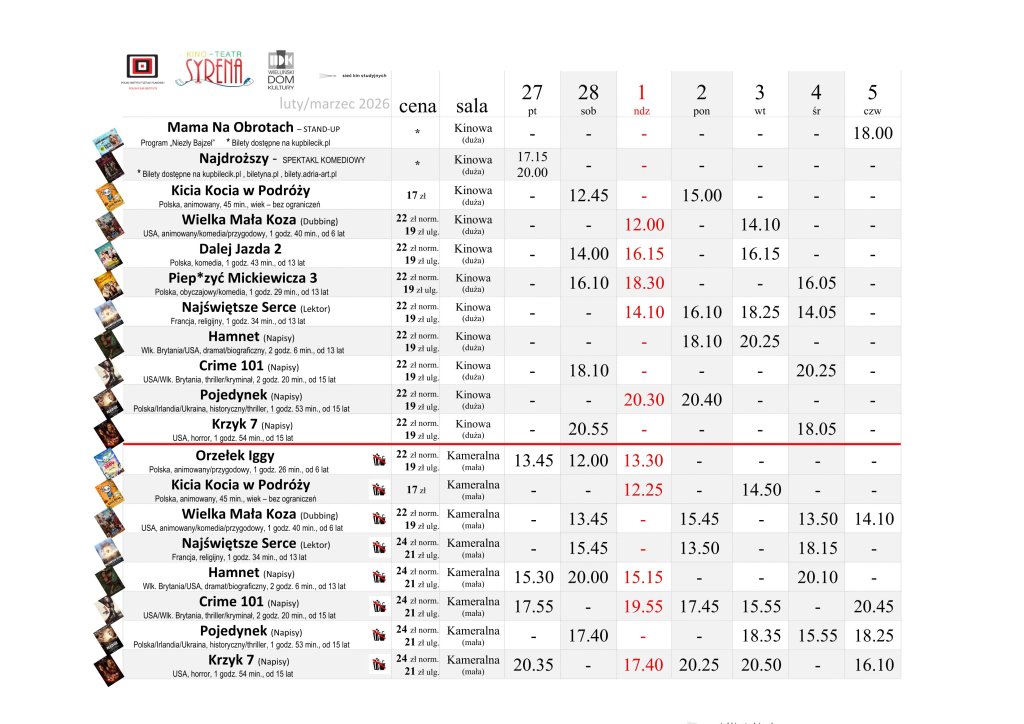 Kino Teatr „Syrena” w Wieluniu zaprasza na seanse filmowe. Na plakacie poniżej prezentujemy, co placówka przy ul. Narutowicza 2 puści w dniach od 27 lutego do 5 marca. Bilety można zakupić TUTAJ.