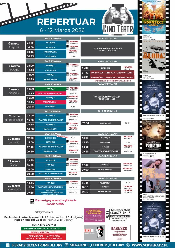 Sieradzkie Centrum Kultury zaprezentowało repertuar kinowy KINO-TEATR SCK SIERADZ obowiązujący od 6 do 12 marca. Oprócz filmów: „Pojedynek” i „Wartość sentymentalna”, będą też dwie premiery – to filmy: „Hopnięci” oraz „Panna młoda!”. W repertuarze są też pokazy krótkometrażowych filmów fabularnych nominowanych do Oscara 2026.