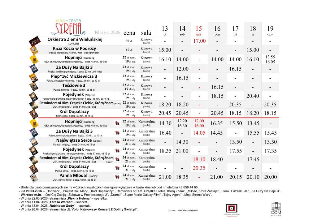 Kino Teatr „Syrena” w Wieluniu zaprasza na seanse filmowe. Na plakacie poniżej prezentujemy, co placówka przy ul. Narutowicza 2 puści w dniach od 13 do 19 marca. Bilety można zakupić TUTAJ.