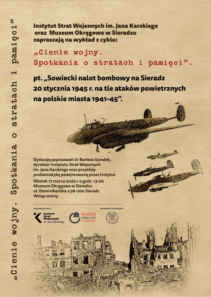 Instytut Strat Wojennych im. Jana Karskiego oraz Muzeum Okręgowe w Sieradzu zapraszają na wykład z cyklu „Cienie wojny. Spotkania o stratach i pamięci”: „Sowiecki nalot bombowy na Sieradz 20 stycznia 1945 r. na tle ataków powietrznych na polskie miasta 1941–1945”.