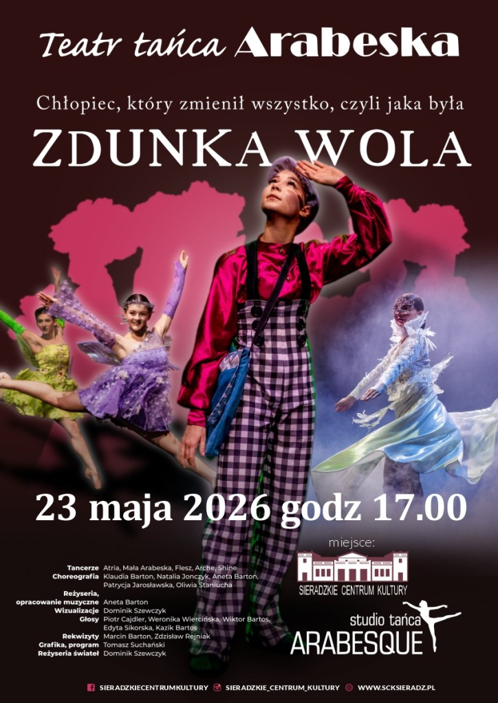 Teatr Tańca Arabeska zaprasza na wyjątkowe widowisko taneczne. „Chłopiec, który zmienił wszystko, czyli jaka była ZDUNKA WOLA” to epicka opowieść o odwadze, przyjaźni i sile dobra. Główny bohater – Zdunek wyrusza w podróż, która wystawi na próbę jego serce i marzenia. Po wielu przygodach i ciężkiej drodze, którą przebył by uratować swoją osadę, zdaje sobie sprawę, że tylko Ci, którzy potrafią zaufać sobie i innym, mogą naprawdę odmienić świat. W spektaklu bierze udział około 80 młodych tancerzy Teatru Tańca Arabeska. Dodatkowych wrażeń dostarczają wizualizacje, wykorzystujące najnowocześniejsze techniki multimedialne. Aby w pełni oddać charakter każdej sceny, przygotowaliśmy dla tancerzy 268 różnorodnych i niesamowicie barwnych kostiumów, a także zbudowaliśmy jedyną w swoim rodzaju scenografię.