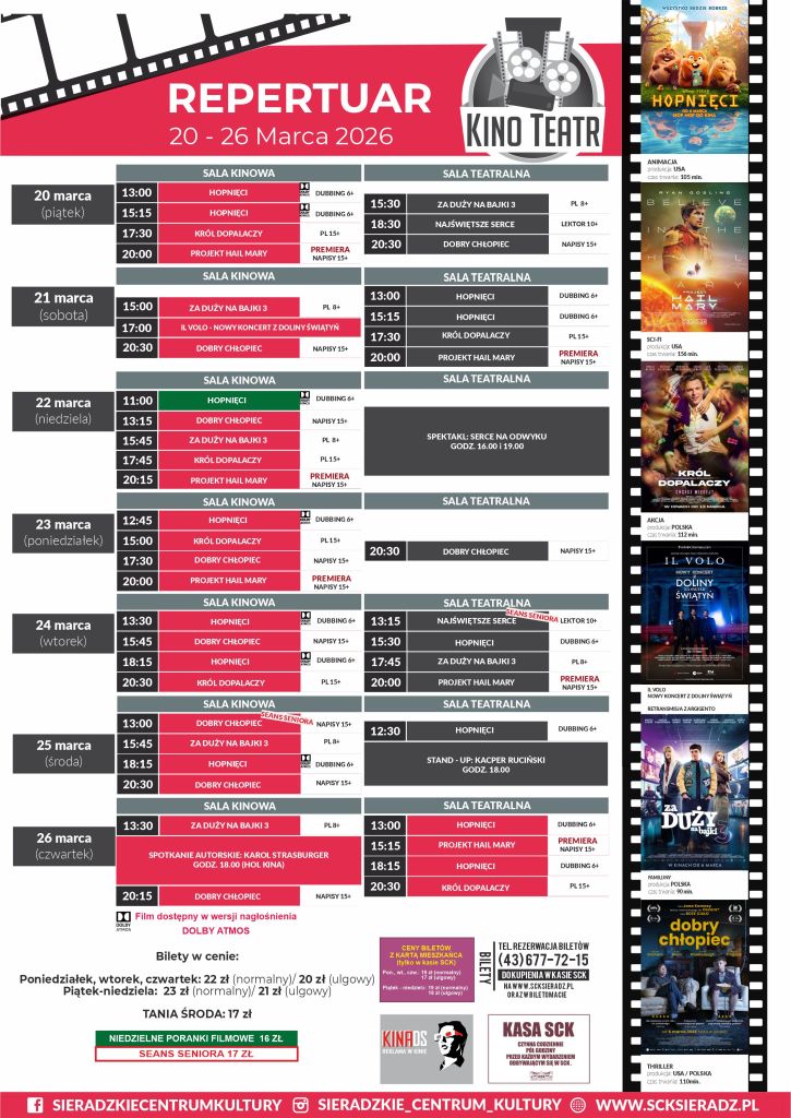 Sieradzkie Centrum Kultury zaprezentowało repertuar kinowy KINO-TEATR SCK SIERADZ obowiązujący od 20 do 26 marca. Oprócz filmów: „Hopnięci”, „Król dopalaczy”, „Najświętsze serce”, „Dobry chłopiec” oraz „Za duży na bajki 3”, będzie też jedna premiera – to film: „Projekt Hail Mary”. Wydarzeniem specjalnym będzie najnowszy koncert Il Volo z Doliny Świątyń.