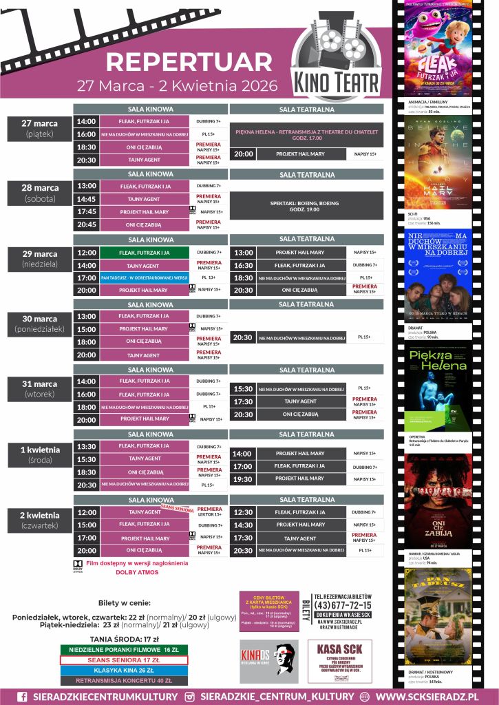 Sieradzkie Centrum Kultury zaprezentowało repertuar kinowy KINO-TEATR SCK SIERADZ obowiązujący od 20 do 26 marca. Oprócz filmów: „Projekt Hail Mary”, „Nie ma duchów w mieszkaniu na dobrej” i „Fleak. Futrzak i ja”, będą też dwie premiery – to filmy: „Oni cię zabiją” i „Tajny agent”.