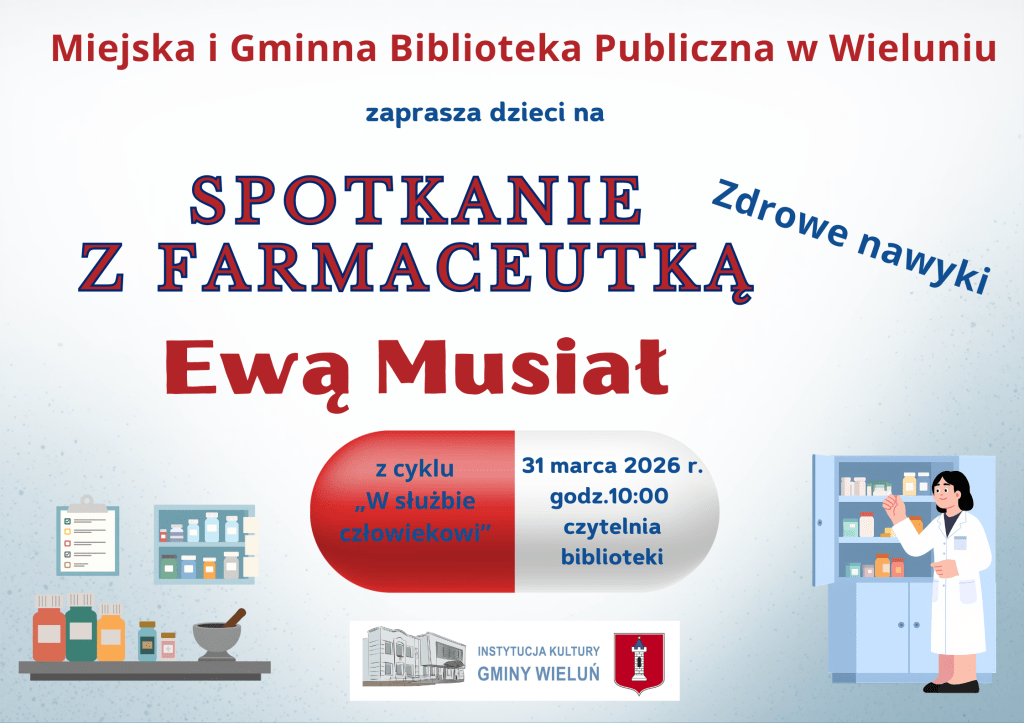 Miejska i Gminna Biblioteka Publiczna w Wieluniu zaprasza dzieci na spotkanie z farmaceutką – Ewą Musiał. Więcej informacji na plakacie poniżej.