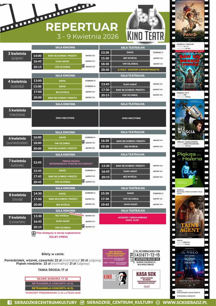 Sieradzkie Centrum Kultury zaprezentowało repertuar kinowy KINO-TEATR SCK SIERADZ obowiązujący od 3 do 9 kwietnia. Pokazane będą filmy: „Oni cię zabiją” i „Tajny agent”, a także nowości: „Bez wyjścia”, „Baw się dobrze i przeżyj” i „David”.