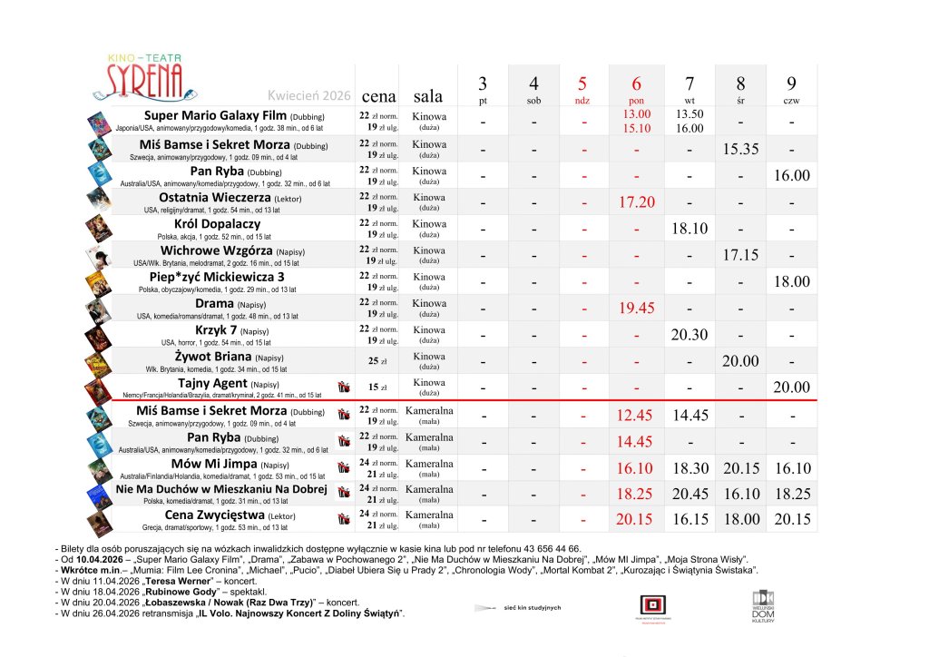 Kino Teatr „Syrena” w Wieluniu zaprasza na seanse filmowe. Na plakacie poniżej prezentujemy, co placówka przy ul. Narutowicza 2 puści w dniach od 3 do 9 kwietnia. Bilety można zakupić TUTAJ.