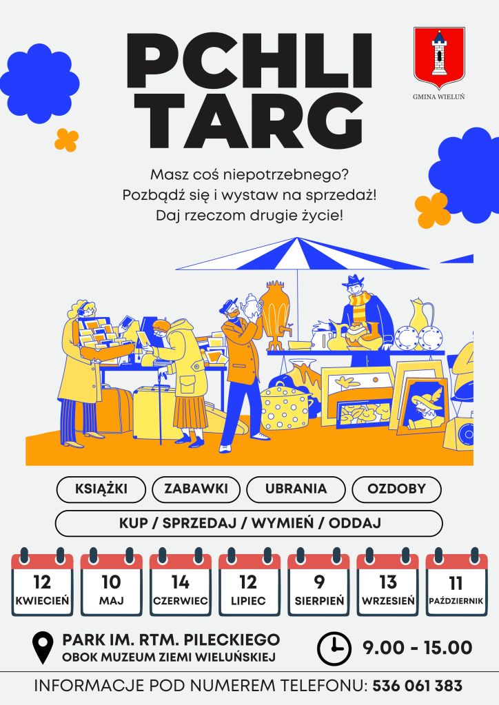 Po raz kolejny Pchli Targ gościć będzie w Parku im. rtm. Pileckiego (obok Muzeum Ziemi Wieluńskiej). Wydarzenie odbędzie się w niedziele: 12 kwietnia, 10 maja, 14 czerwca, 12 lipca, 9 sierpnia, 13 września, 11 października.