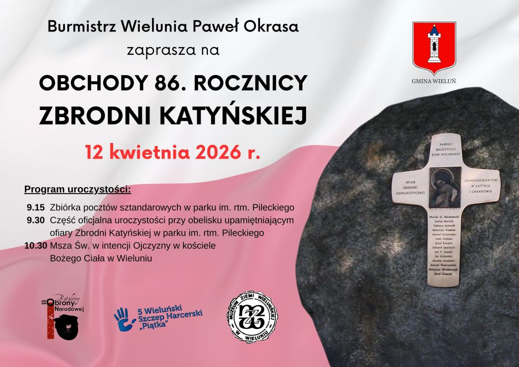 Burmistrz Wielunia – Paweł Okrasa, wspólnie z Muzeum Ziemi Wieluńskiej, Batalionami Obrony Narodowej oraz 5. Wieluńskim Szczepem Harcerskim „Piątka” zapraszają na obchody 86. rocznicy Zbrodni Katyńskiej. Więcej szczegółów na plakacie poniżej.
