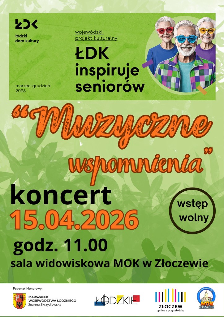 W środę 15 kwietnia w sali widowiskowej MOK w Złoczewie o godz. 11.00 odbędzie się koncert pt. „MUZYCZNE WSPOMNIENIA”, który jest organizowany w ramach projektu „ŁDK inspiruje seniorów”.