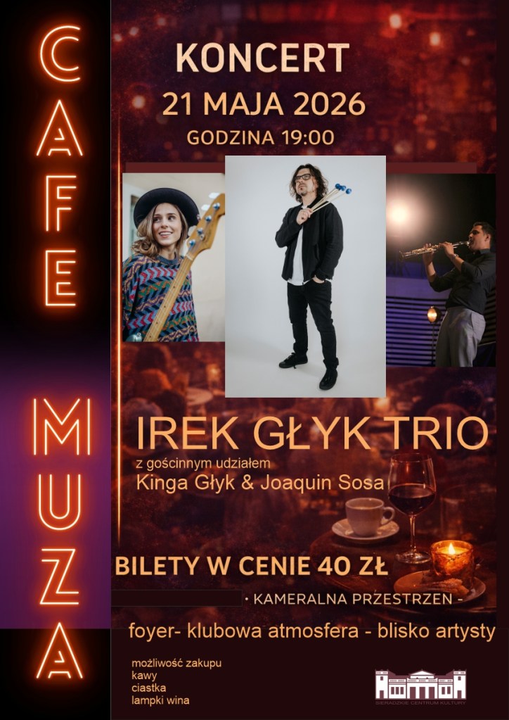 Sieradzkie Centrum Kultury zaprasza na koncert Irek Głyk Trio z gościnnym udziałem Kingi Głyk (gitara basowa) i Joaquina Sosy (klarnet, saksofon), który odbędzie się 21 maja (czwartek) o godz. 19:00 we foyer Sieradzkiego Centrum Kultury.