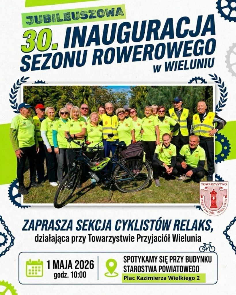 Towarzystwo Przyjaciół Wielunia zaprasza 1 maja (piątek) pod budynek Starostwa Powiatowego i Urzędu Miejskiego przy pl. Kazimierza Wielkiego 2 na tradycyjne rozpoczęcie sezonu rowerowego. Inauguracja odbędzie się po raz 30. Start – godz. 10:00.
