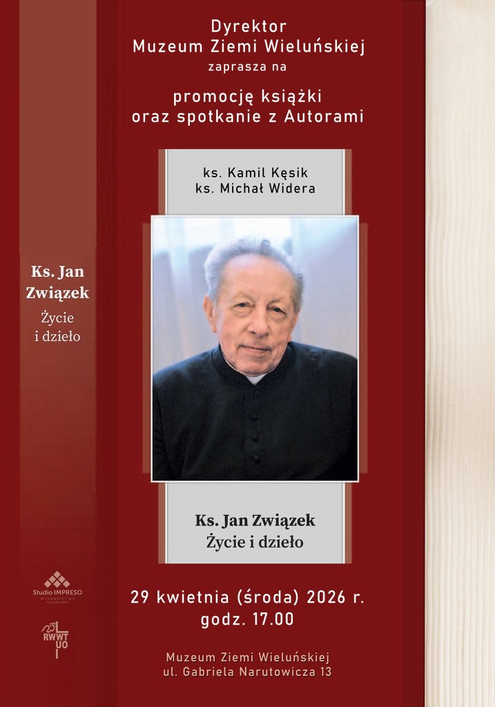 Muzeum Ziemi Wieluńskiej zaprasza na spotkanie z ks. Kamilem Kęsikiem oraz ks. Michałem Widerą – autorami książki: Ks. Jan Związek. Życie i dzieło. Spotkanie odbędzie się 29 kwietnia (środa) o godz. 17.00.