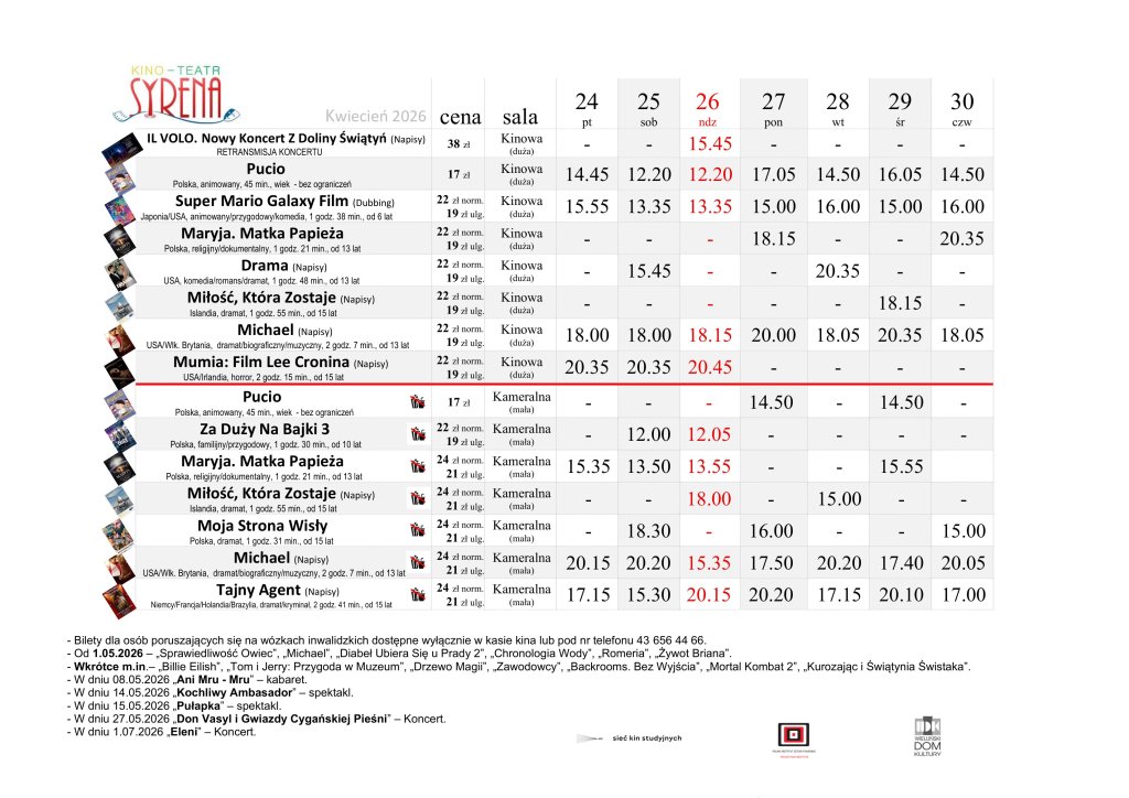 Kino Teatr „Syrena” w Wieluniu zaprasza na seanse filmowe. Na plakacie poniżej prezentujemy, co placówka przy ul. Narutowicza 2 puści w dniach od 17 do 23 kwietnia. Bilety można zakupić TUTAJ.